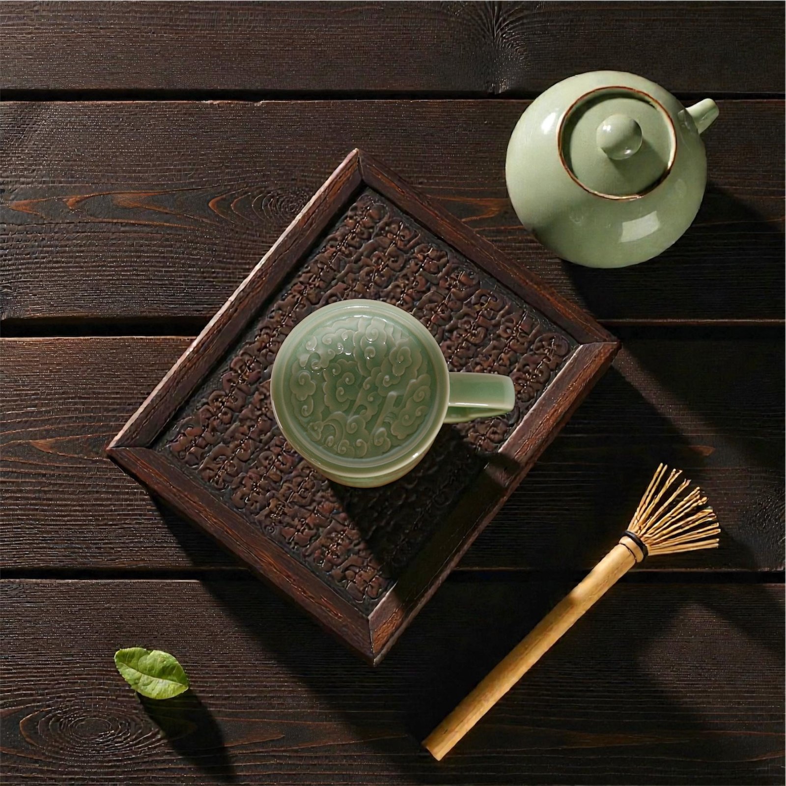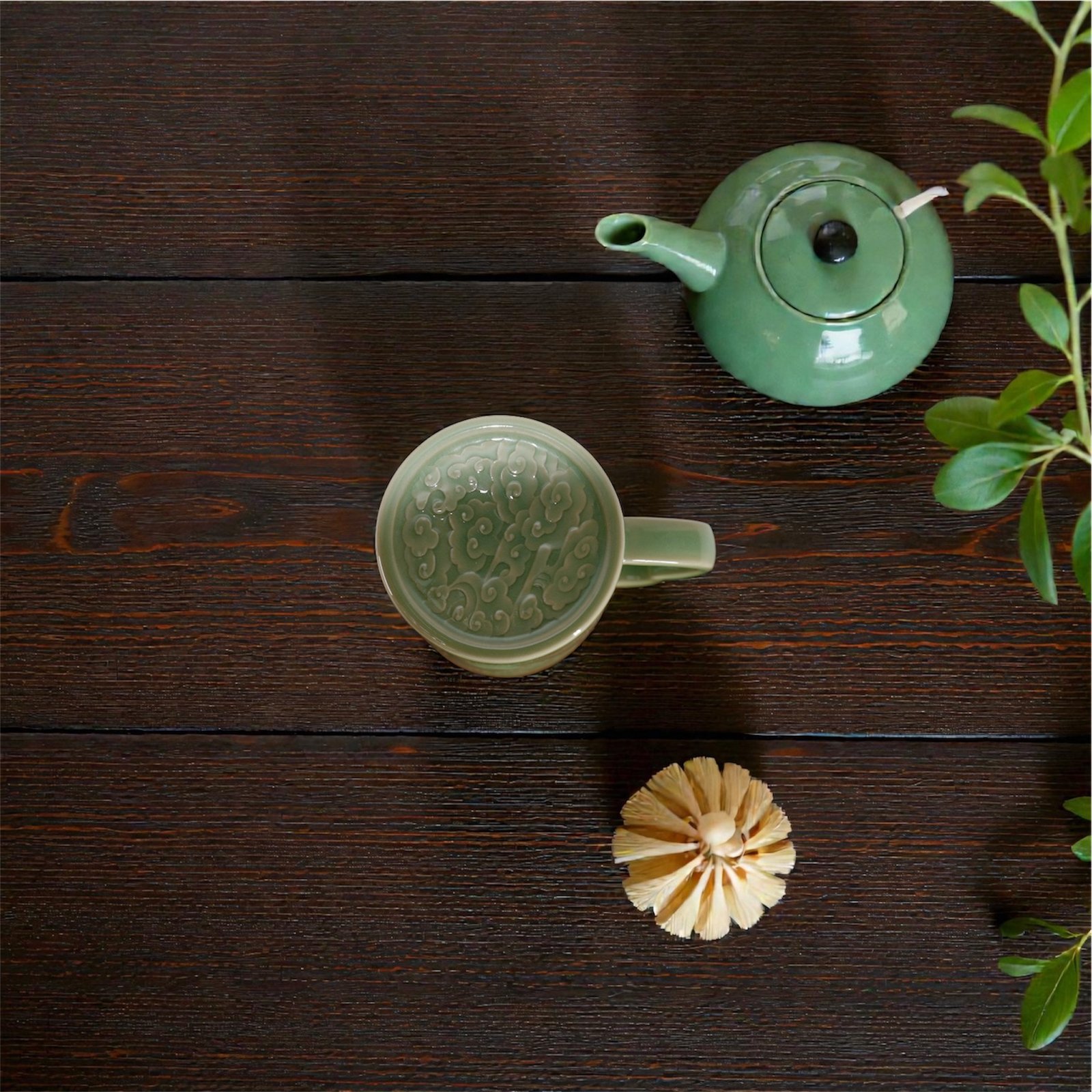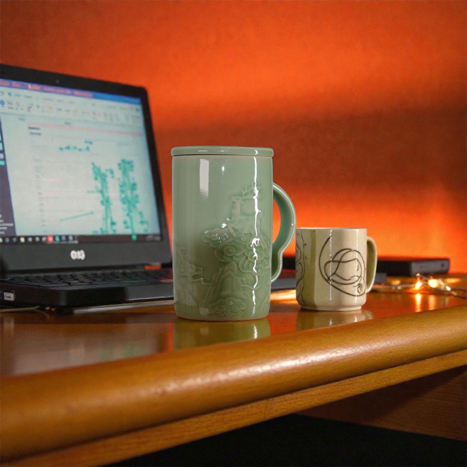 The “Auspicious Deer” Yaozhou Celadon Mug integrates traditional carved decoration into a contemporary daily-use form. The body features a delicately carved deer motif among flowing clouds, a classical symbol of harmony, prosperity, and upward progression. Beneath the translucent celadon glaze, the design appears subtly layered, revealing depth as light shifts across the surface.