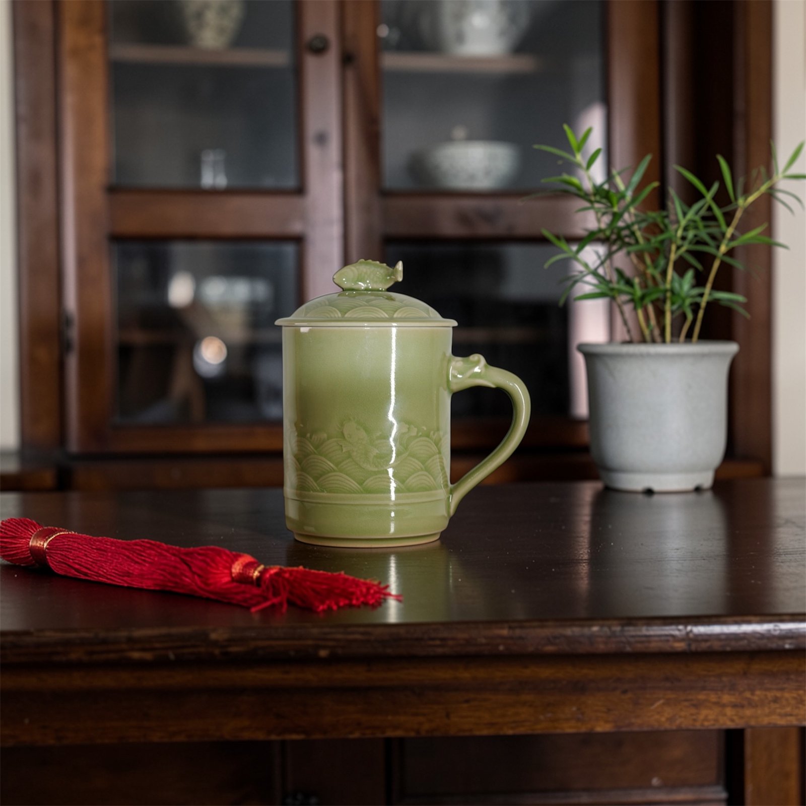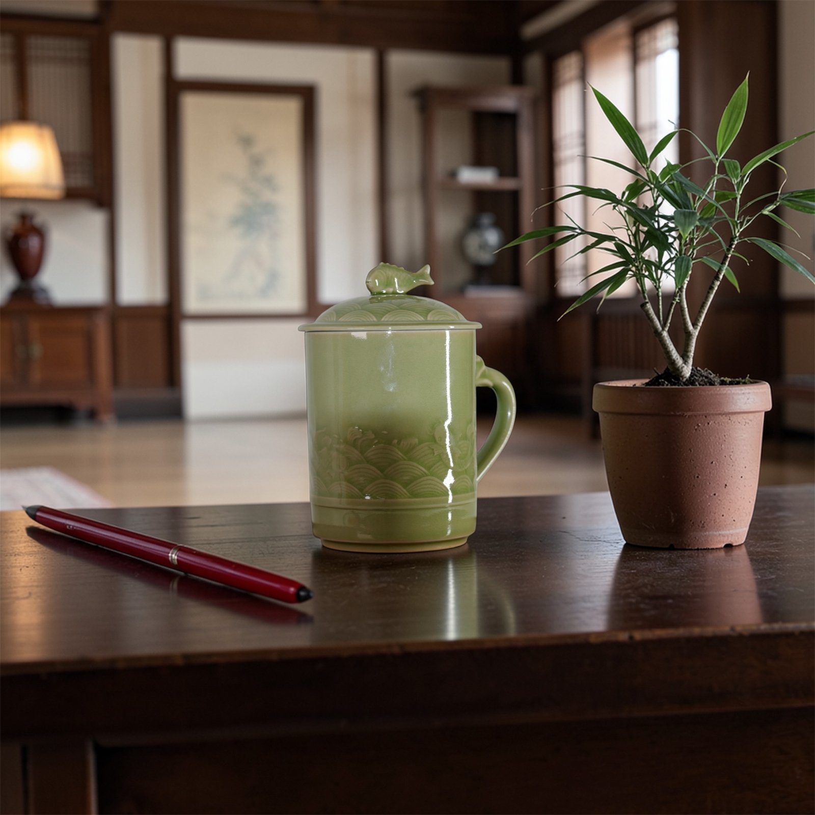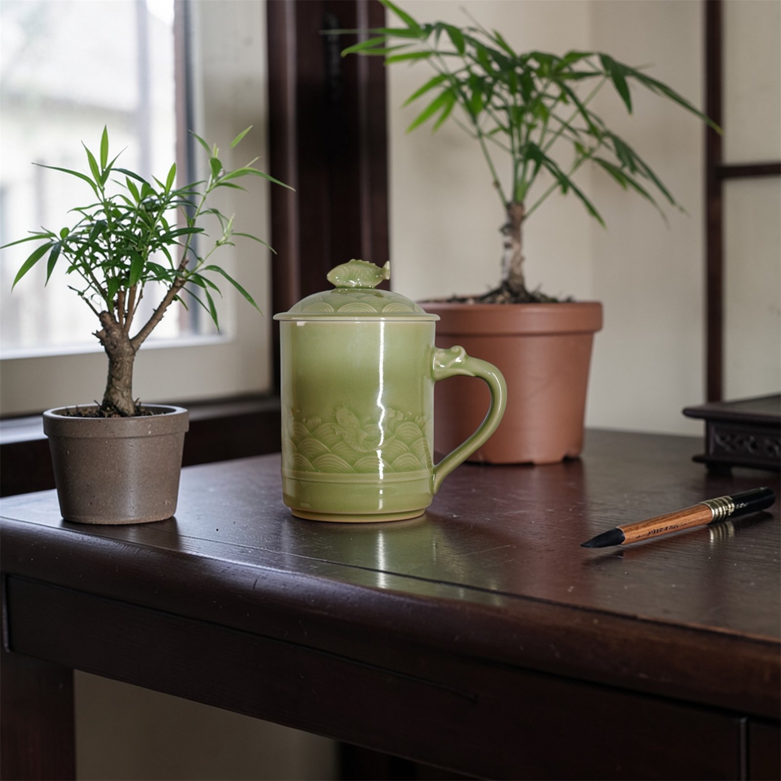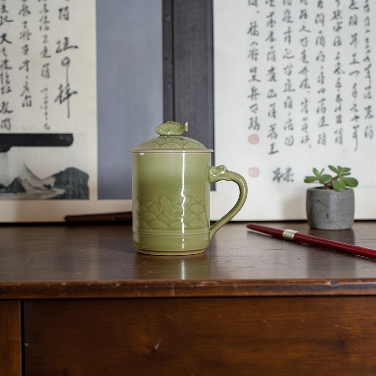 The mug presents a balanced and upright silhouette with a naturally curved handle for a comfortable grip. The lid is topped with a sculpted fish-shaped finial that echoes the main design while helping to retain warmth and protect the beverage from dust. The soft celadon tone brings a sense of calm and elegance to study rooms, offices, or tea settings.